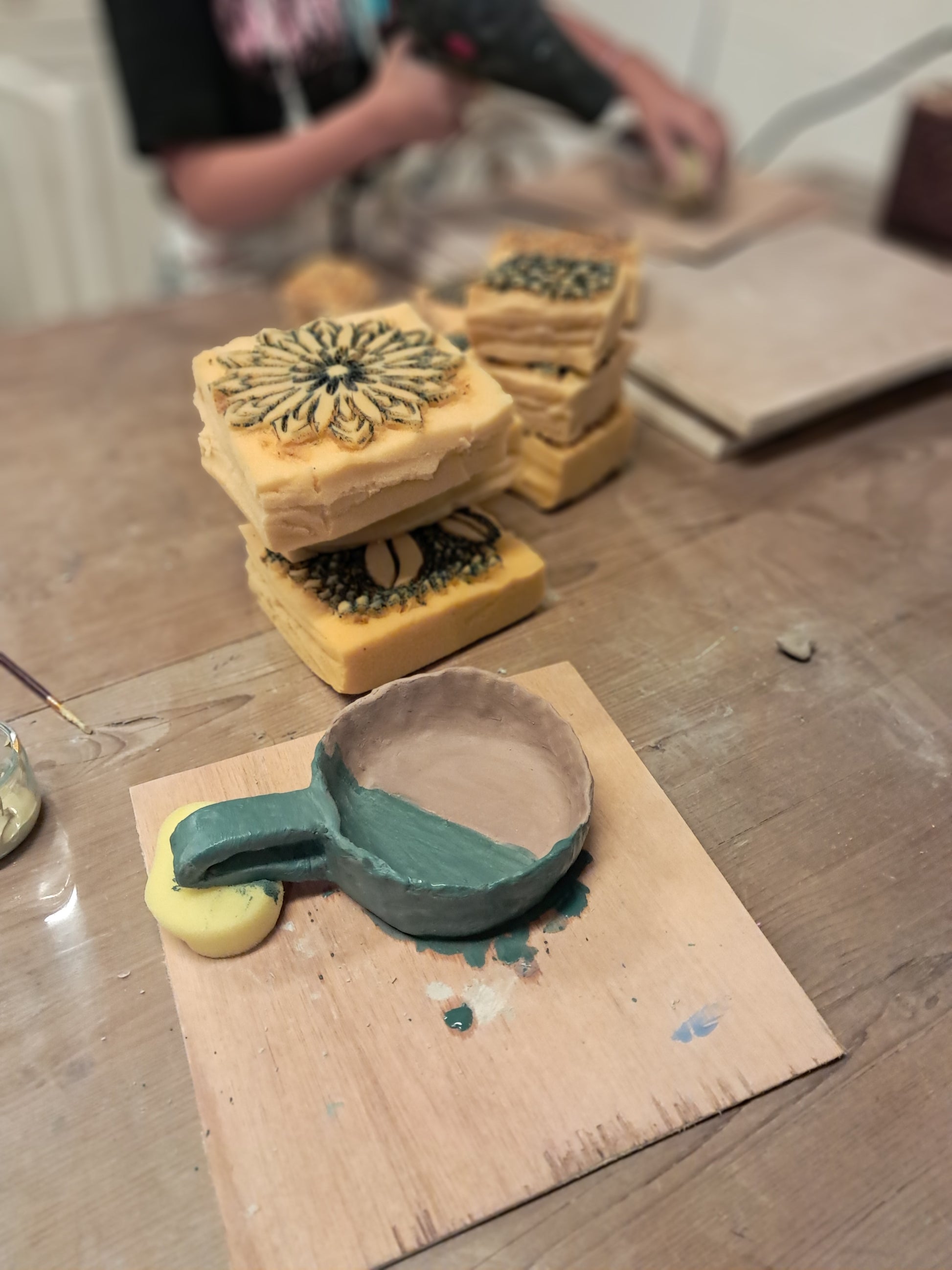 Dans une ambiance douce et attentive, votre enfant découvrira les gestes essentiels du modelage et pourra ensuite décorer sa pièce à l’aide d’engobes — une véritable peinture sur céramique qui permet d’exprimer librement couleurs et émotions.