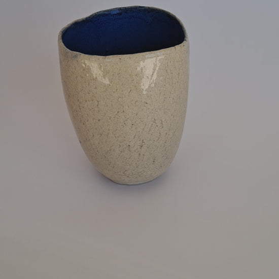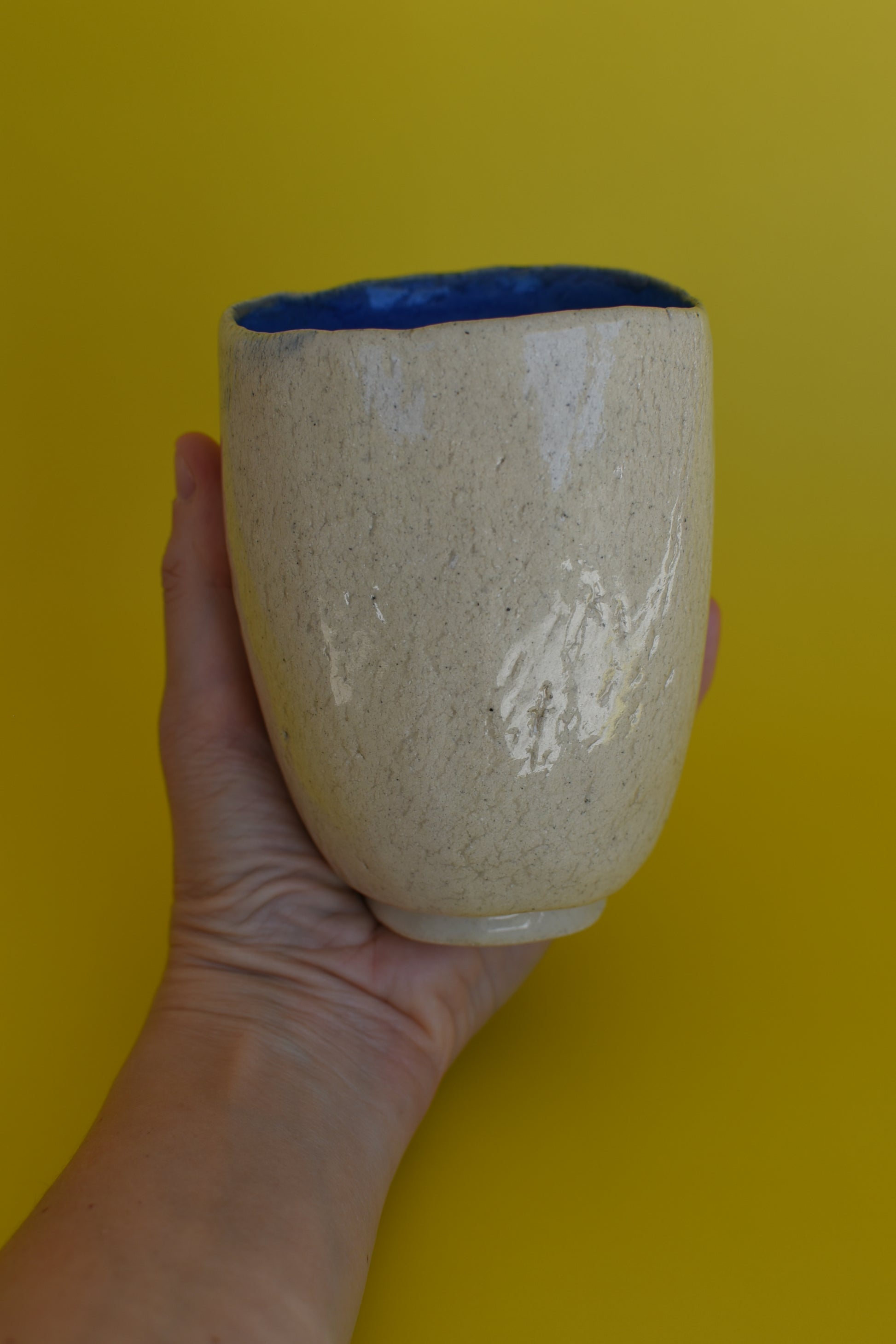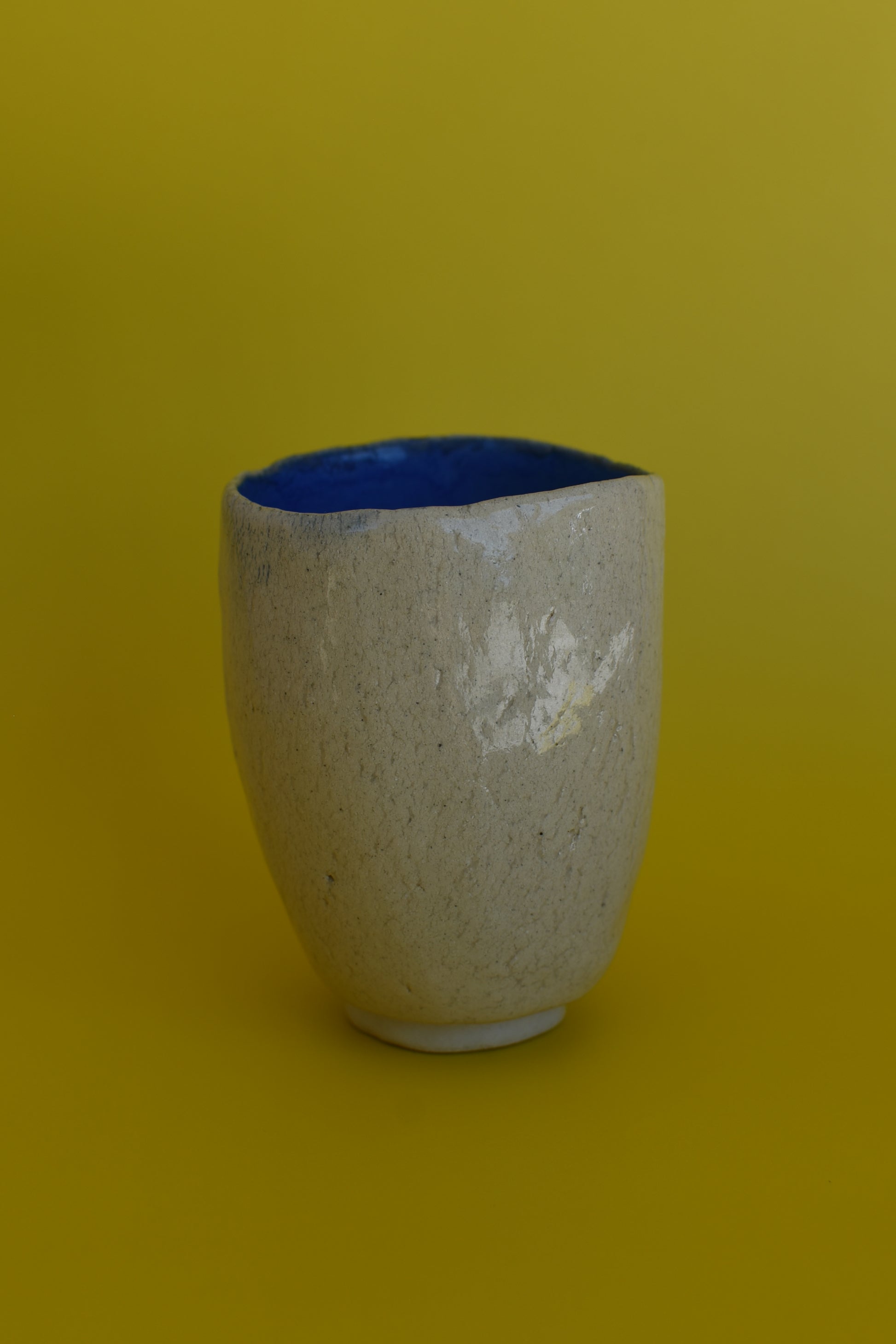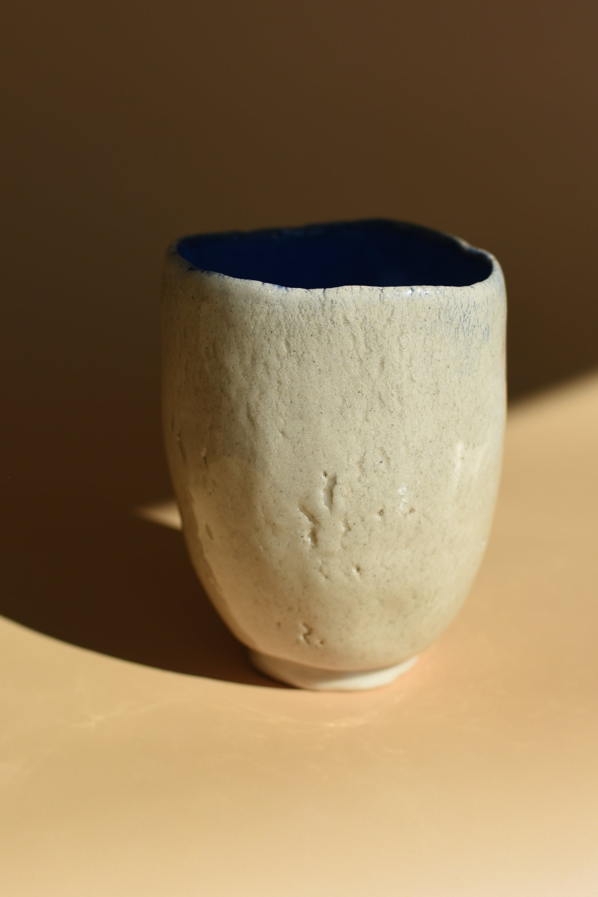 Modelée à la main en grès blanc, cette grande tasse explore les limites de la terre. Sa forme est volontairement poussée, travaillée pour laisser apparaître à l’extérieur les craquelures naturelles de l’argile — comme une trace du temps qui passe, un paysage érodé que la matière révèle seule.