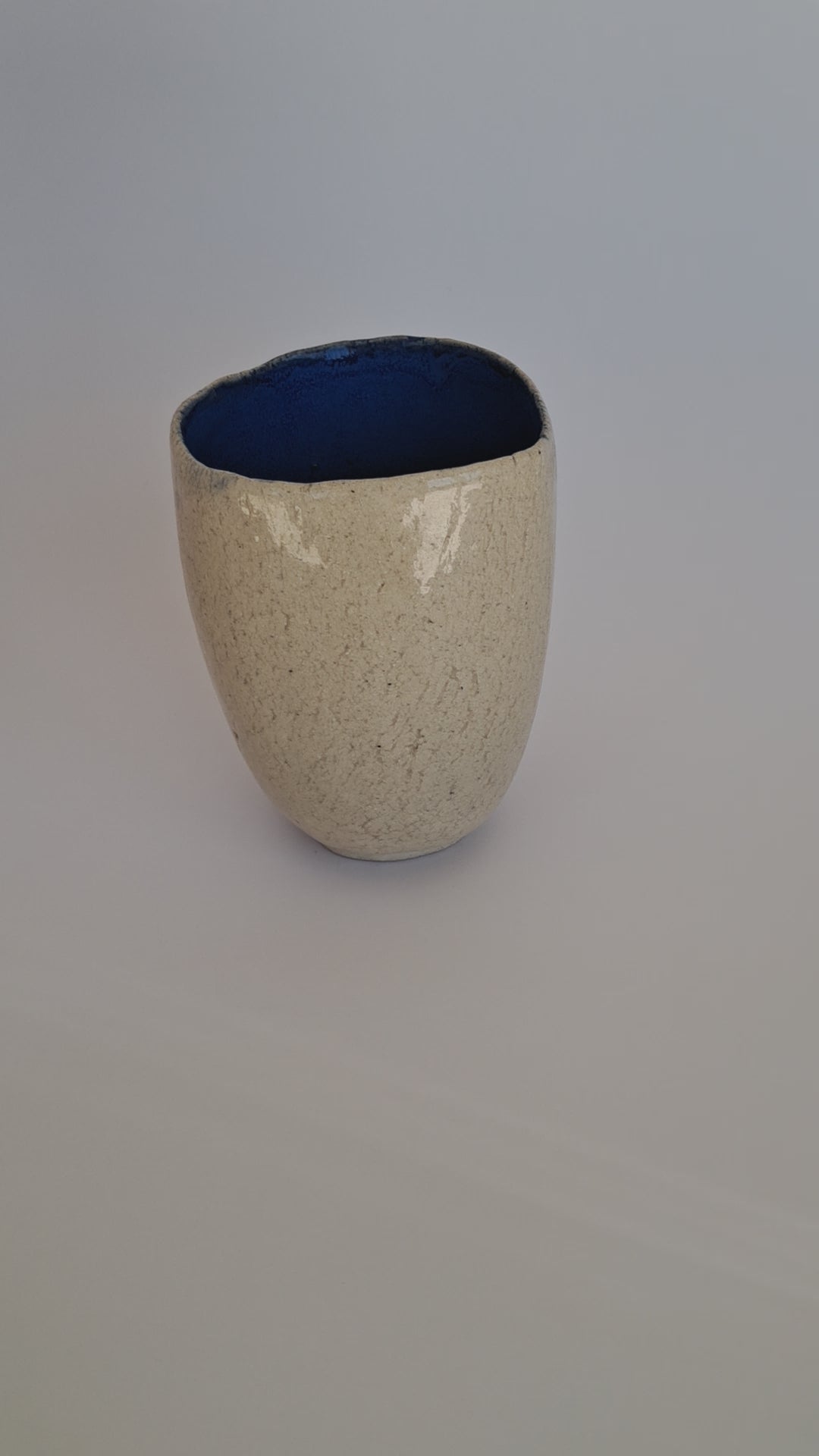 L’intérieur est émaillé d’un bleu profond, émail de ma création, tandis que l’extérieur est simplement recouvert d’un émaillage transparent, pour laisser visibles les textures et les fissures du grès.