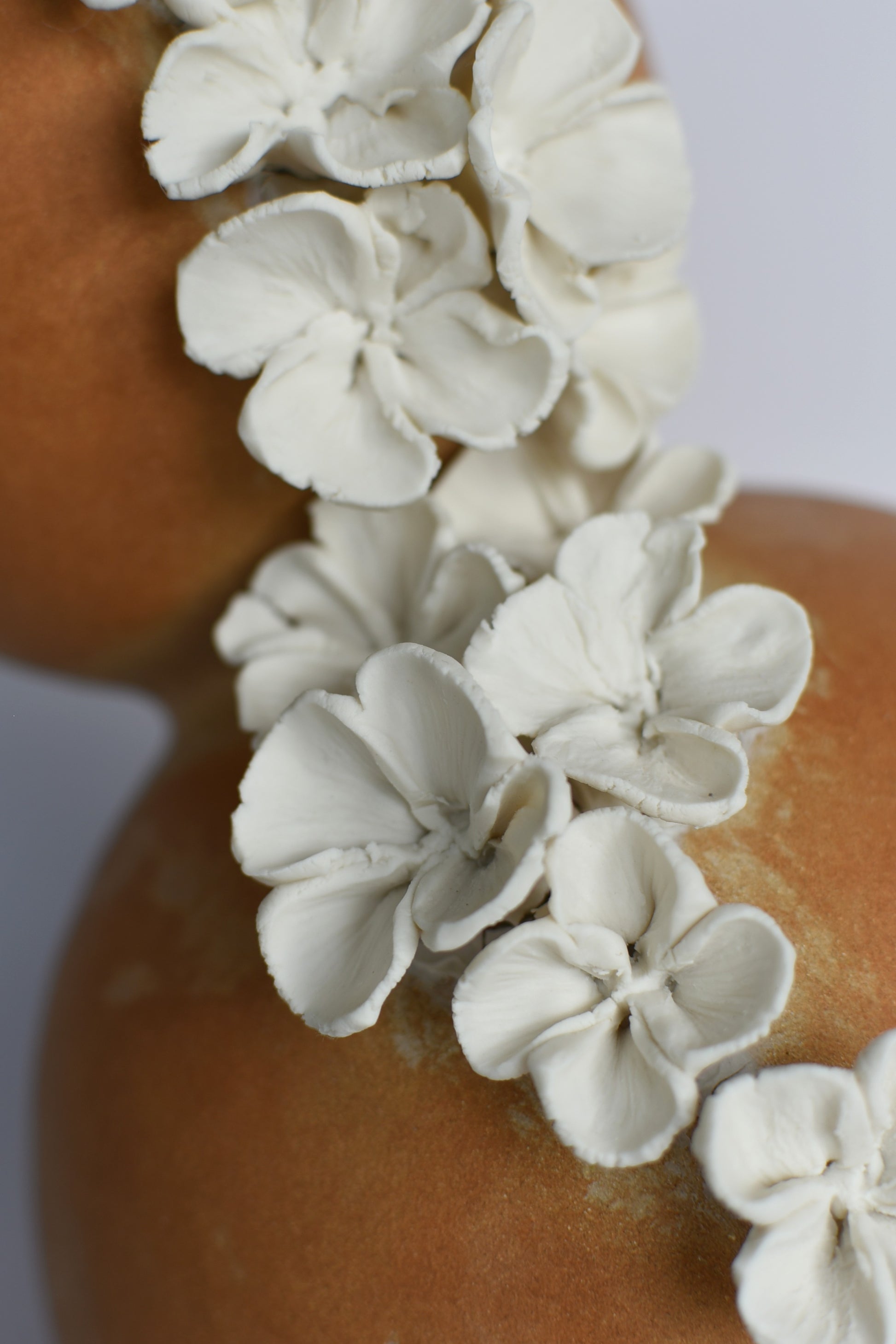 Chaque élément semble tenir dans un équilibre fragile, presque vivant, invitant le regard à circuler, à chercher le point de bascule… ou d’harmonie. Pour contraster avec les volumes bruts et polis du grès, j’ai orné la sculpture de fleurs en porcelaine blanche, délicatement modelées à la main, comme une ponctuation légère et silencieuse.