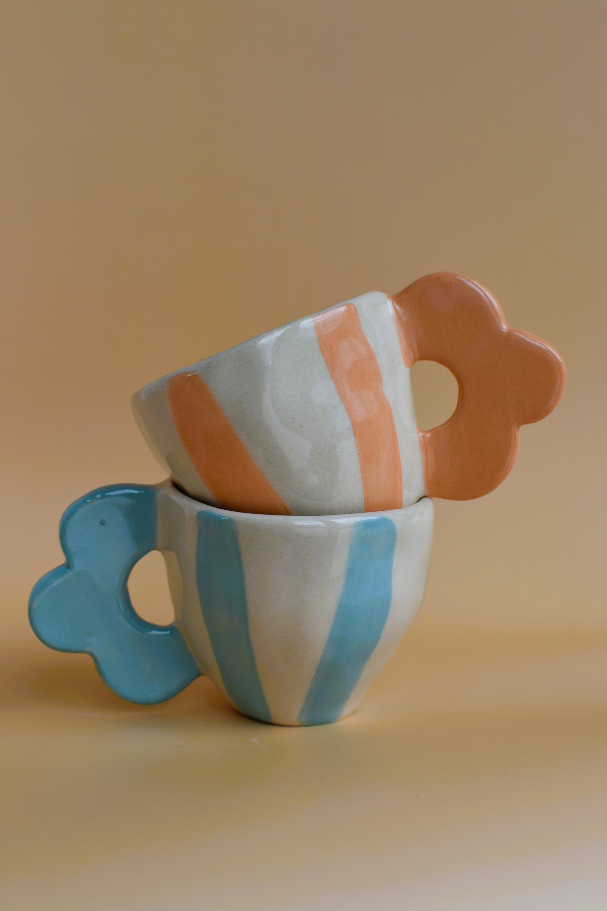 Chaque tasse est façonnée une à une en grès blanc, puis décorée à la main de rayures colorées qui laissent apparaître la trace du geste.